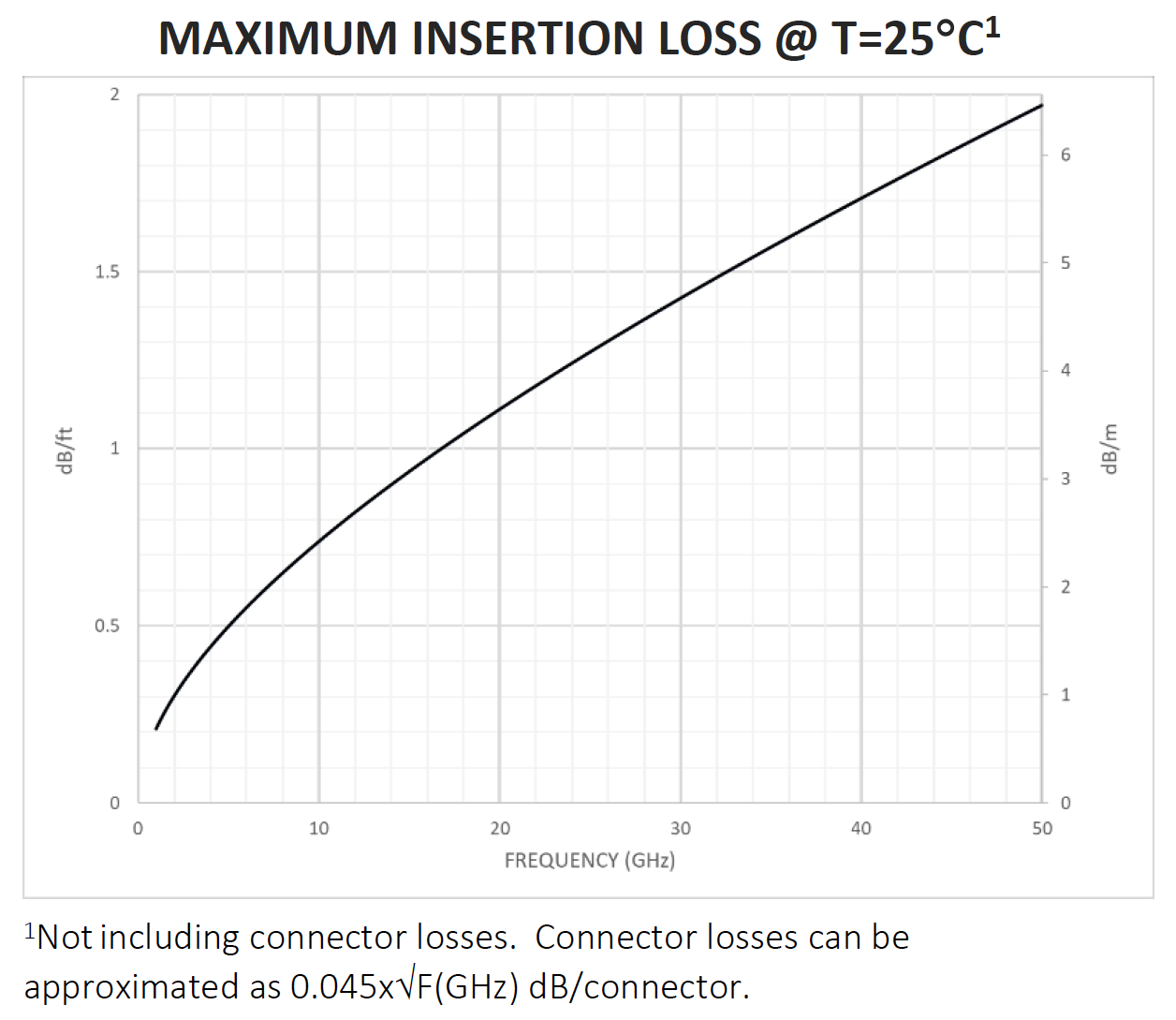 • VSWR:最高1.4:1 (2.92 mm & 2.40 mm),直流最高达26.5 GHz:最高1.2:1 (SMPM),26.5 GHz至50 GHz:最高1.4:1 (SMPM),最高1.3:1 (SMA)