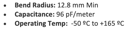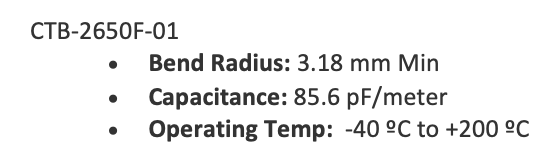 • 双电缆选项: 1) Samtec 26 AWG,高温微型同轴 (CTB-2650F-01),或 2) RG 316 (24 AWG)